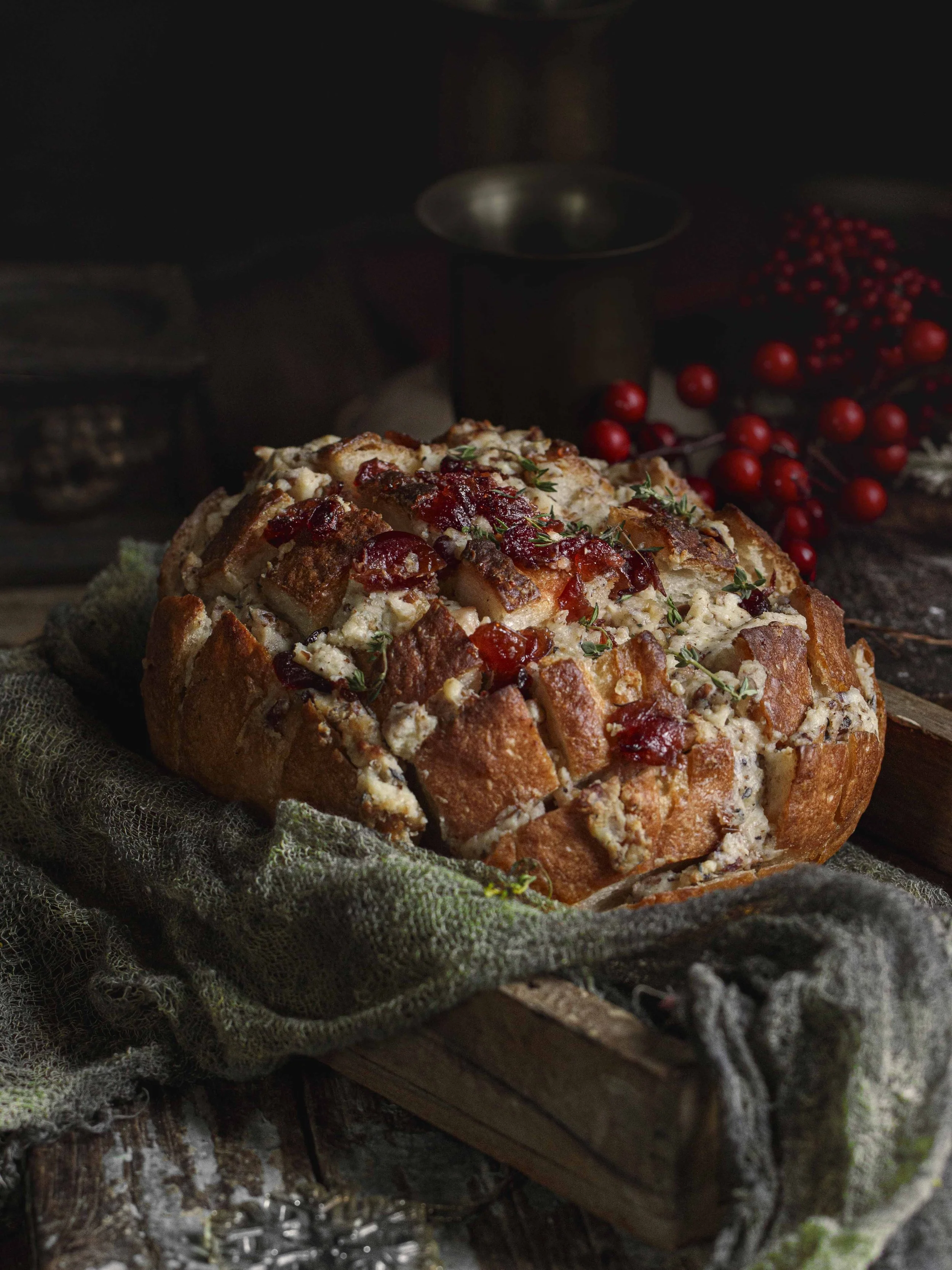 A buttery brioche, cream cheeses, herbs, walnuts, and a tart cranberry sauce come together in a beautiful pull-apart bread that carries all the flavours of the festive season.